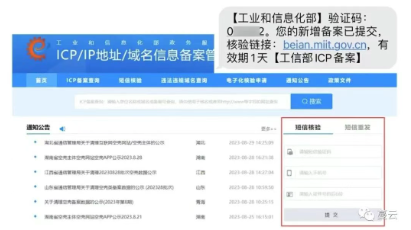 工信部短信核验:初审通过后,会收到工信部发送的核验短信(发送号码:12381),需在收到短信的24个小时内登录工信部备案官网首页完成短信核验,短信核验成功后备案申请进入通管局审核流程。若核验时提示验证码错误或无效,可触达一次短信重发;24小时内未核验成功,备案将被工信部系统自动驳回,就要重新提交备案申请。