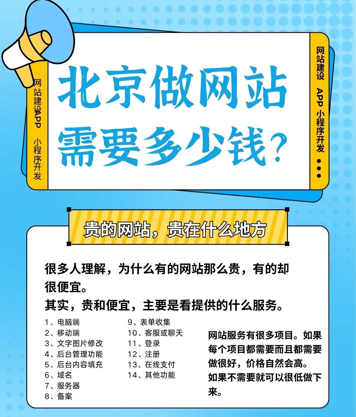 基础服务: 网站和服务器(不含域名)的起价为100元。 整站模板网站: 提供完整的后台和栏目功能,活动价格为598元(有效期至2025年2月之前)。 整站定制: 包含域名、服务器等,具体价格需根据客户需求确定。
